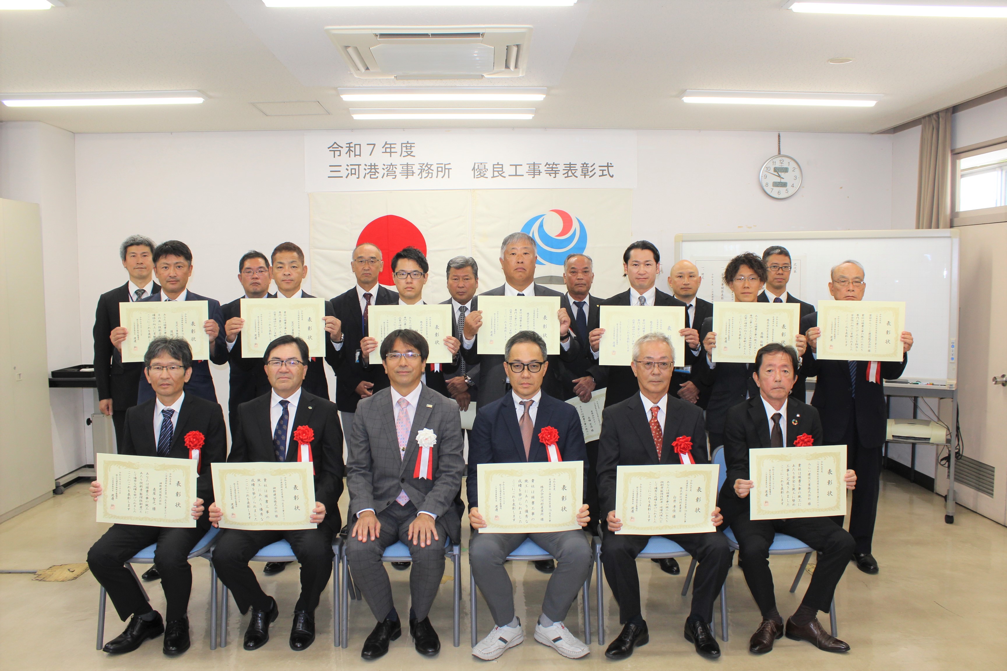 この度、弊社が施工した「令和5年度 三河港神野地区岸壁(-10m)改良工事(その2)」において、令和7年度優良工事表彰及び優良工事技術者表彰の表彰を受けました。